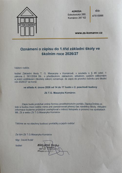 Dobrý den vážení rodiče, na níže umístěném odkazu se můžete od 12.1.2026 přihlásit k zápisu online prvňáčků na Zš T.G. Masaryka Komárov pro školní rok 2026/27, který proběhne dne 4.2.2026 od 14 hod v budově školy. V aplikaci si prosím rezervujte konkrétní čas zápisu.