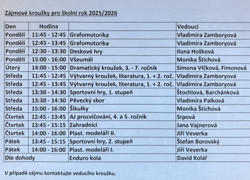 Vážení rodiče, níže uvádím nabídku příměstských táborů pro rok 2026. V případě zájmu prosím kontaktujte příslušného vyučujícího. S pozdravem Mgr. David Kolář